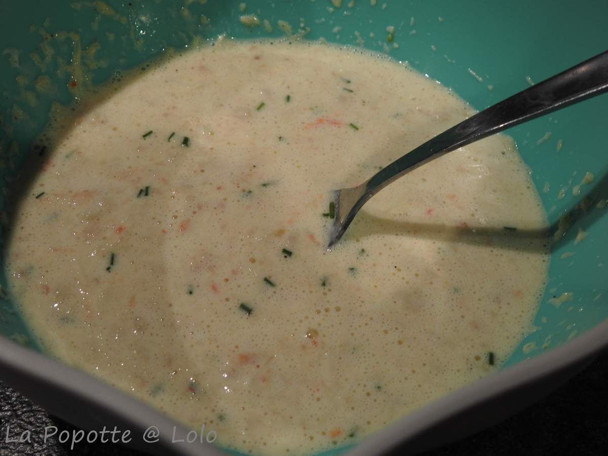 * Battre les œufs avec la crème liquide; ajouter la chair de crabe égouttée, la ciboulette et le parmesan. Saler et poivrer.